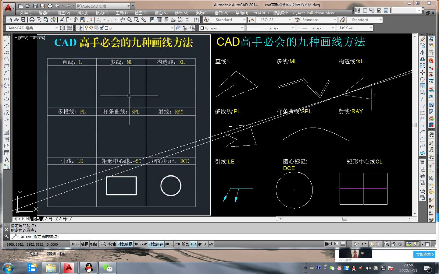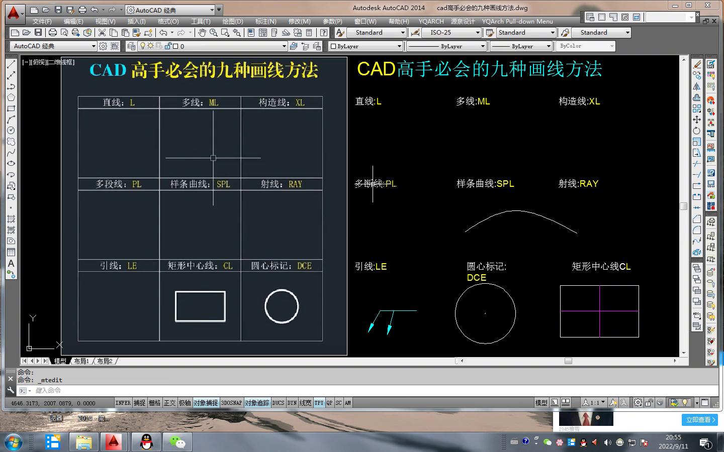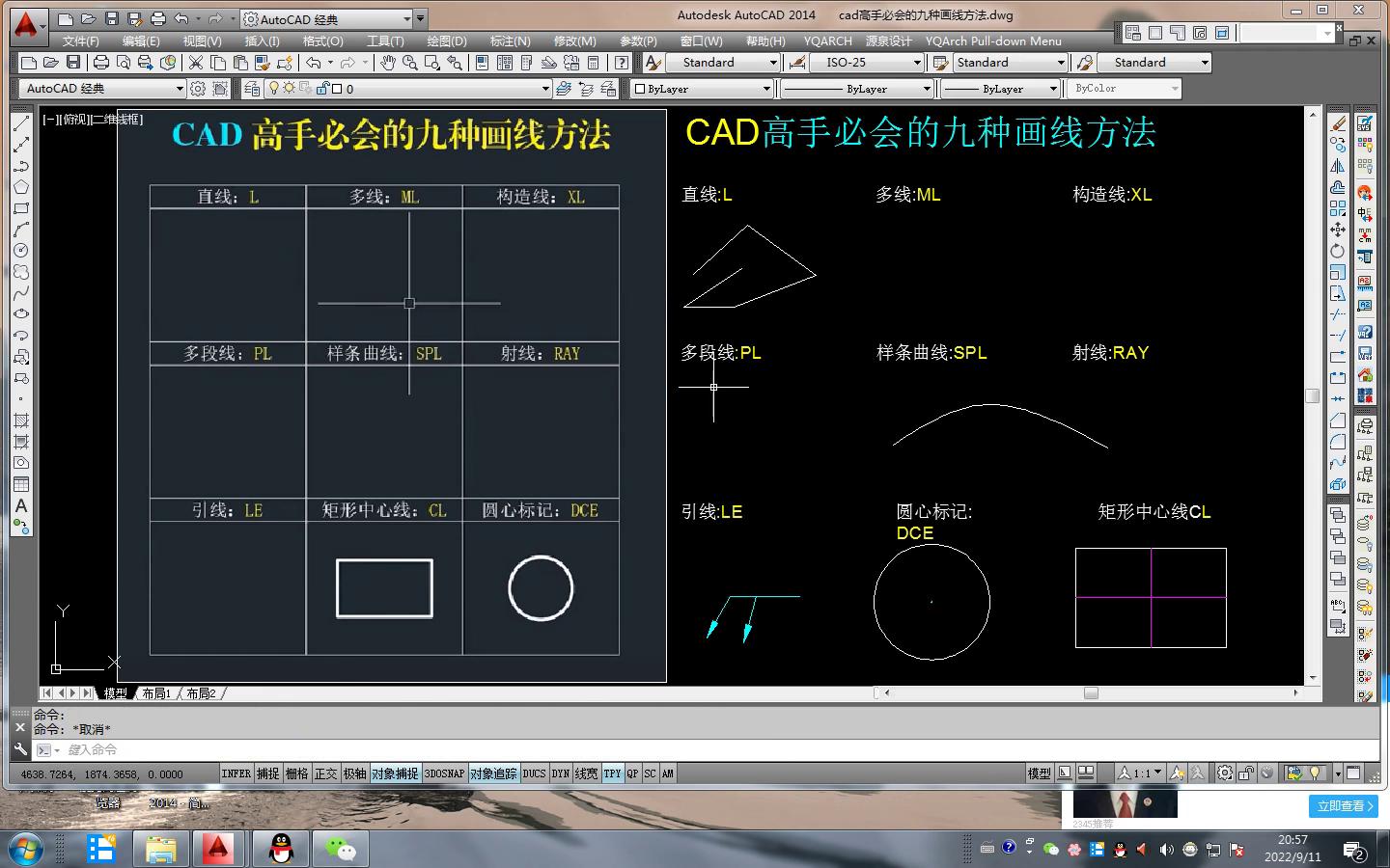 ·第九种:引线。在命令函数L、E空格,先选中引线引线点,针胶关闭,画个斜线,再针胶打开,再输入文字,回车键,回车,输入文字,这就引线,非常方便。