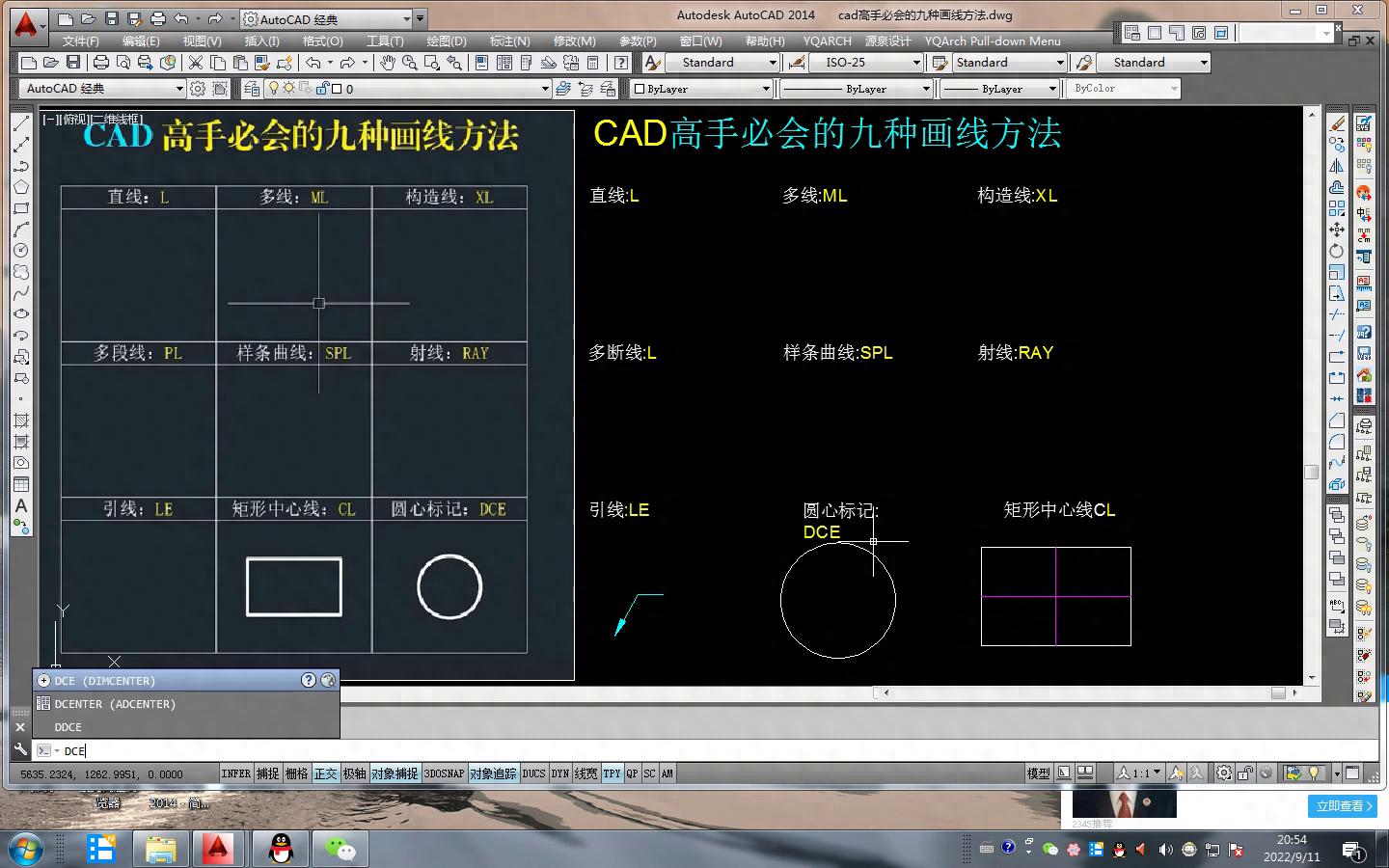 首先看第九种:中心矩形中心线。命令CL,在命令上输入CL空格,然后依次选中矩形的横边和竖边,直接绘制出中心线。