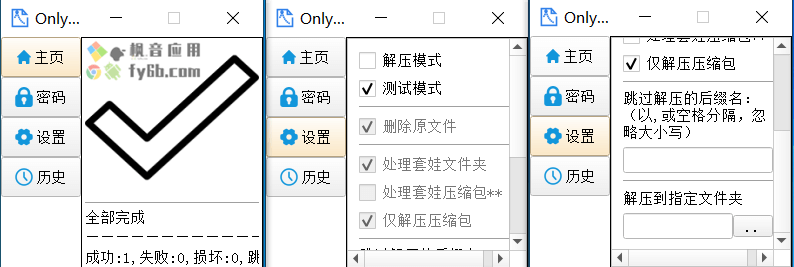 OnlyUnzip是一款纯用于跑密码本的解压工具,类似于UZIP,解压功能基于7zip命令行,相当于省去了敲7zip命令行的操作。