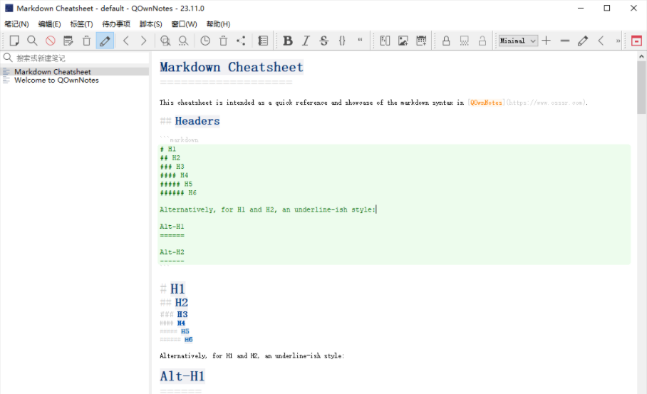 Markdown 支持:QOwnNotes 支持 Markdown 格式,这是一种简单而强大的标记语言,用于格式化和排版文本。您可以使用 Markdown 语法创建漂亮的笔记,并添加标题、列表、链接、图片等元素。