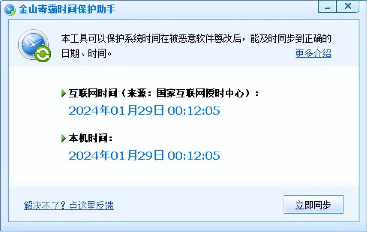 这是一款提取自金山毒霸的小程序,用于给自己当前系统校准时间,一键即可同步到网络正确时间。