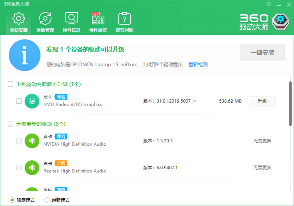 硬件类无法驱动,大概率就是驱动程序出了问题,使用这款免安装的 360 驱动大师解决你的各种电脑故障。