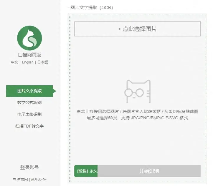 图片文字提取:最多可选择50张,支持JPG/PNG/BMP/GIF/SVG 格式。