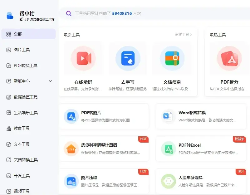 帮小忙是一个提供各种图片、PDF转换、数据换算、生活娱乐、教育、文本、文档转换、开发工具的在线工具箱。