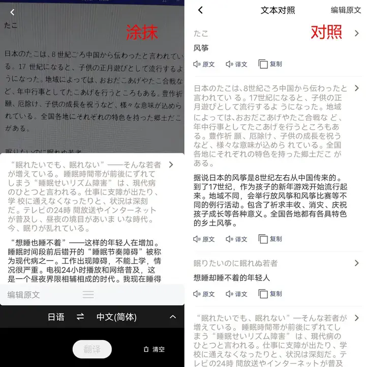 操作和其他软件差不多,但我们可以通过“涂抹”精准翻译范围,实现“涂到哪儿翻译到哪儿”!还能借助“对照”,让阅读更加方便!