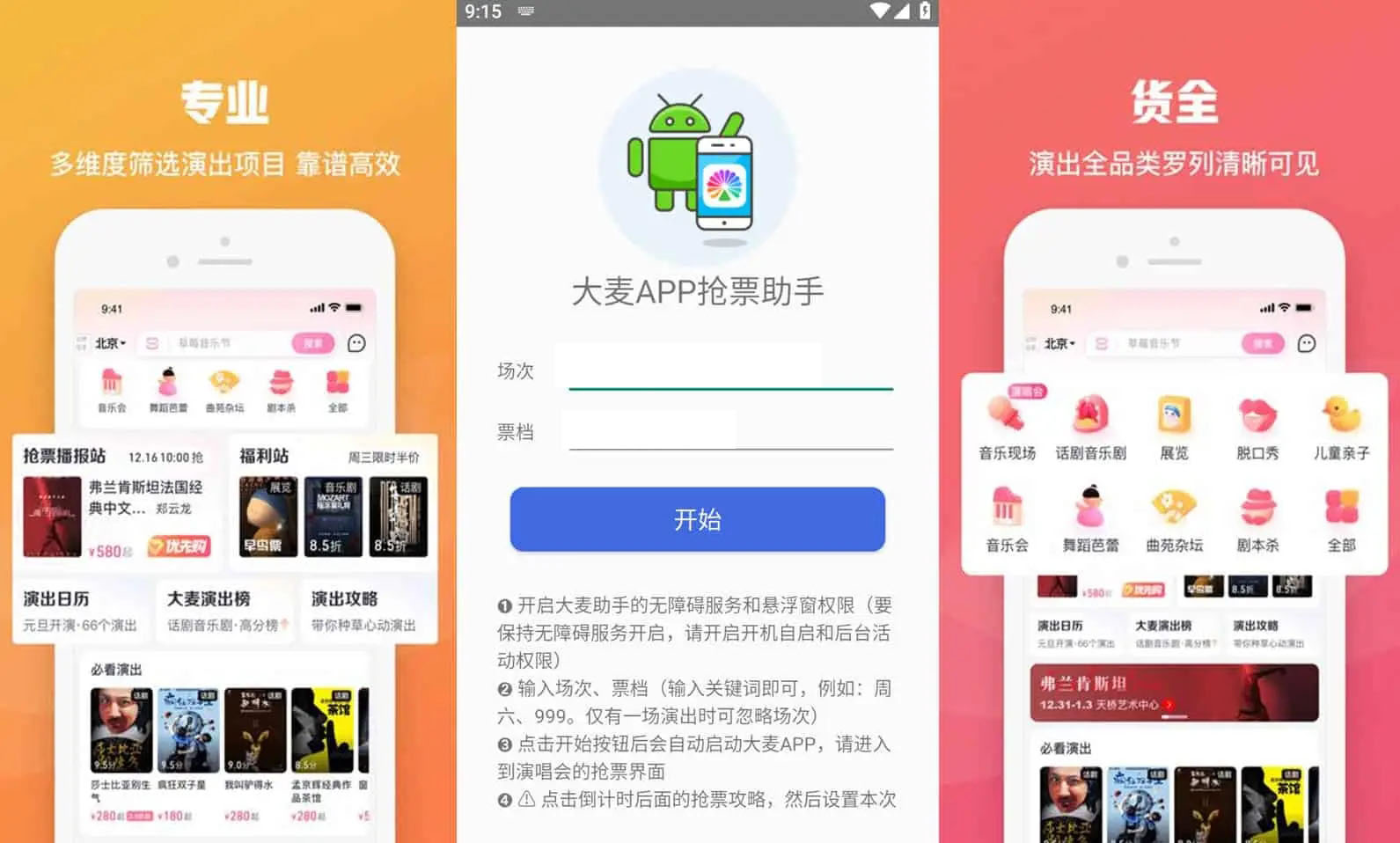 大麦助手app是一款专门为大麦app开发的一款抢票软件,大麦抢票助手应用程序的实时更新最新数据,使您可以随时轻松掌握所需的火车票数量和站点信息,手上的信息可以随时更新,使用拼音首字母可以快速搜索,也可以使用简化的拼音和模糊查询汉字。